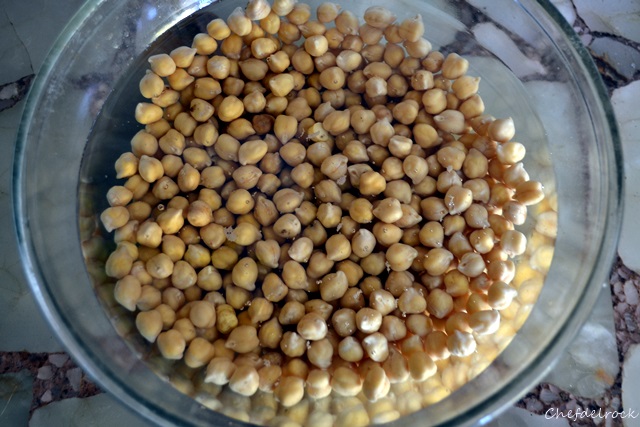 Colocar en un bol u olla los garbanzos y dejar en remojo con agua fría durante 12 horas.