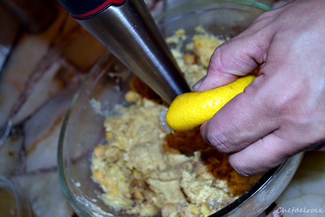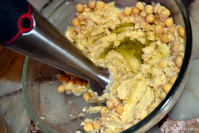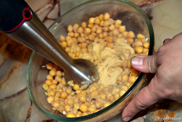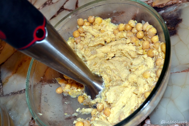 Una vez tiernos, colar los garbanzos procurando reservar el agua de cocción. Dejar enfriar 15 minutos y procesarlos, junto con los dientes de ajo, sal, pimienta, limón, aceite, comino y el tahin.