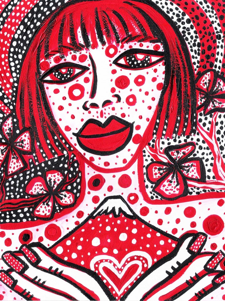 Tuve la suerte de visitar Japón y me encontré con un país maravilloso, lleno de amor, respeto y hasta sentí que encontraba secretos de la vida a cada paso, ciervos que son dioses encarnados y caminan libremente entre los templos en las ciudades, ceremonias ancestrales que se respetan, bullicio y silencio, naturaleza y tecnología unidas a cada paso, rapidez y calma, y sentís ese constante ying yang en el que vivimos en la actualidad pudiendo decidir de que lado queres estar. Yayoi Kusama quería ser una gran artista y lo consiguió, tal vez no pueda reconocer hasta donde llego a cumplir su sueño pero me hizo reflexionar cuan conectada esta al mundo que puede descifrarlo en esa obsesión infinita al punto, cuando continuamente corremos detrás de puntos sin saber a veces el porque. Ella me inspira amor, simple y fácil es su arte y esa misma simpleza la convierte en exquisita.